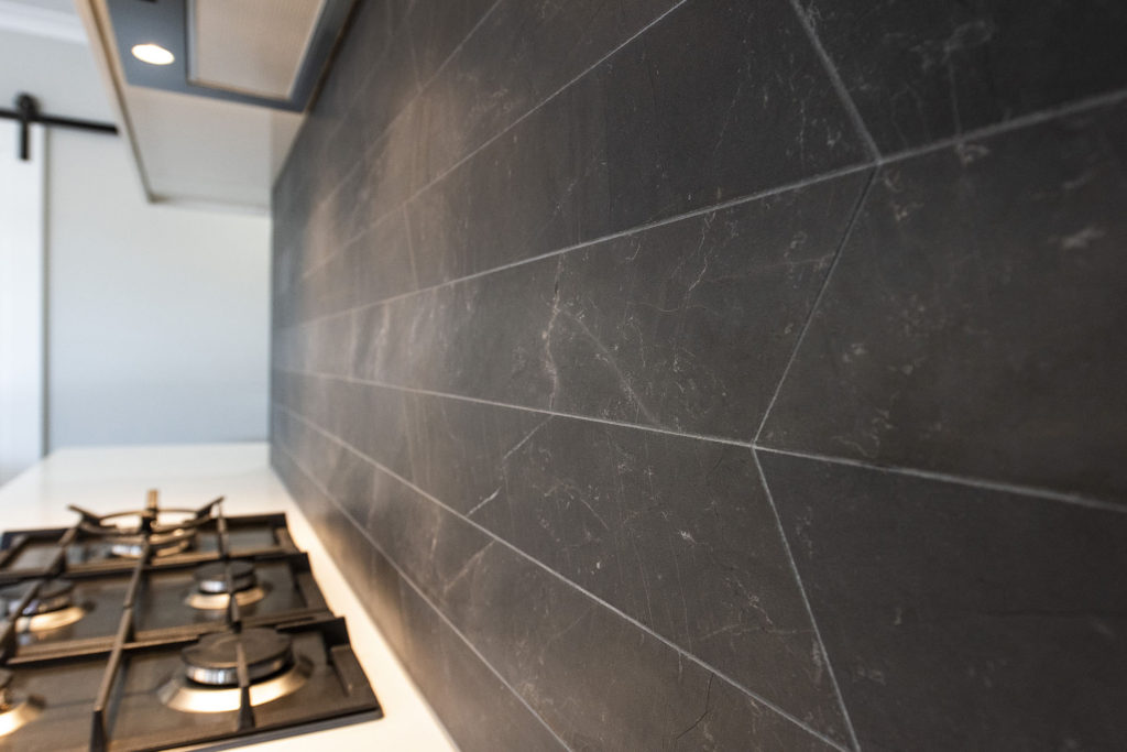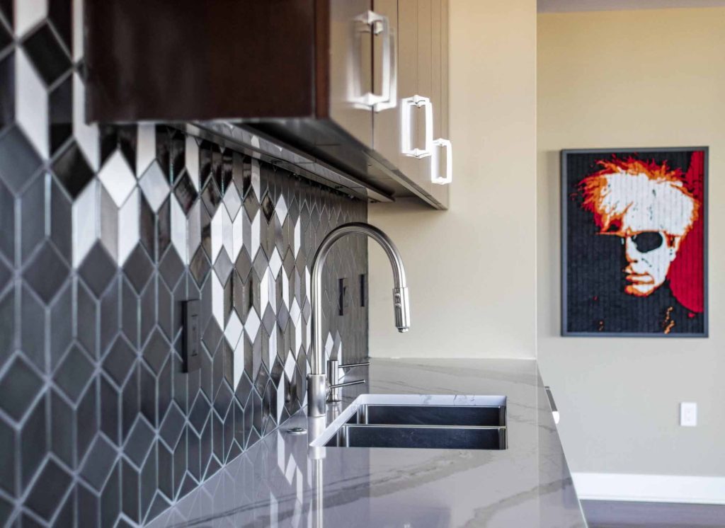 К этому стилю можно отнести и рельефный орнамент, состоящий из геометрических линий. Особенно элегантно будет смотреться фартук, составленный из белой, черной плитки.