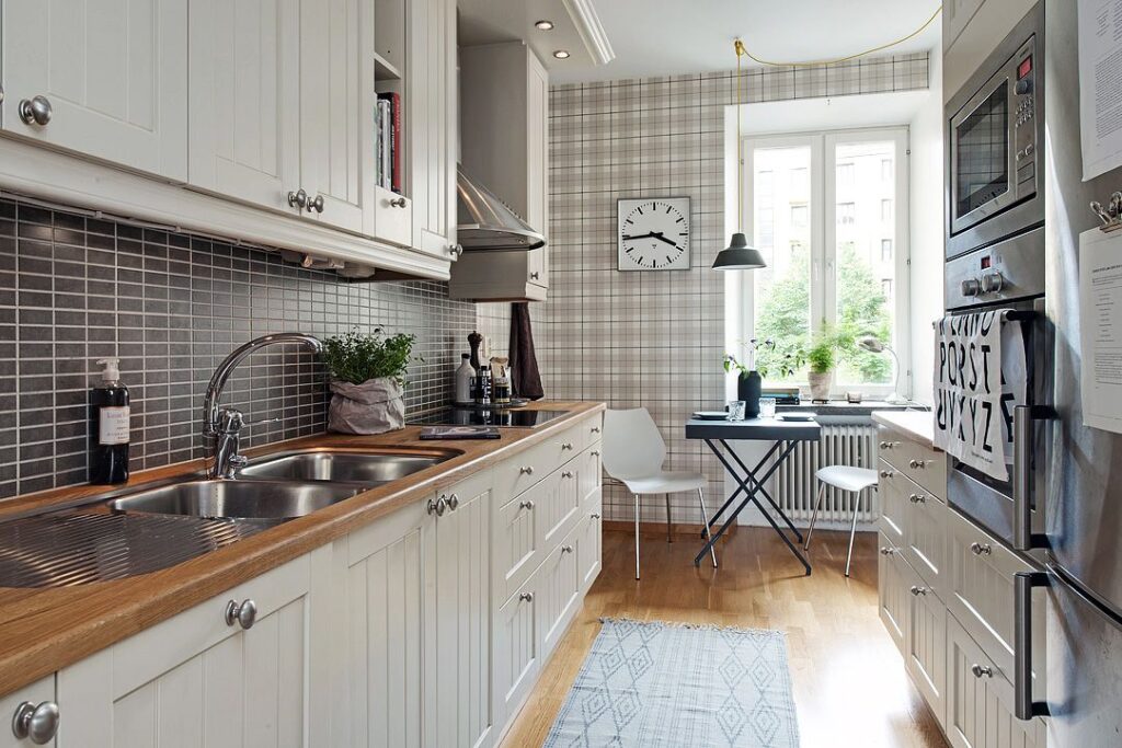 Кухонный фартук представляет собой пространство стены между навесными шкафчиками и рабочим столом.