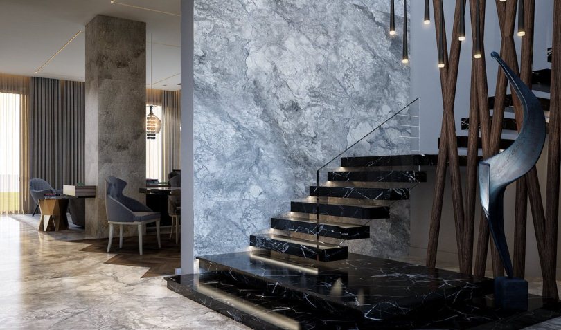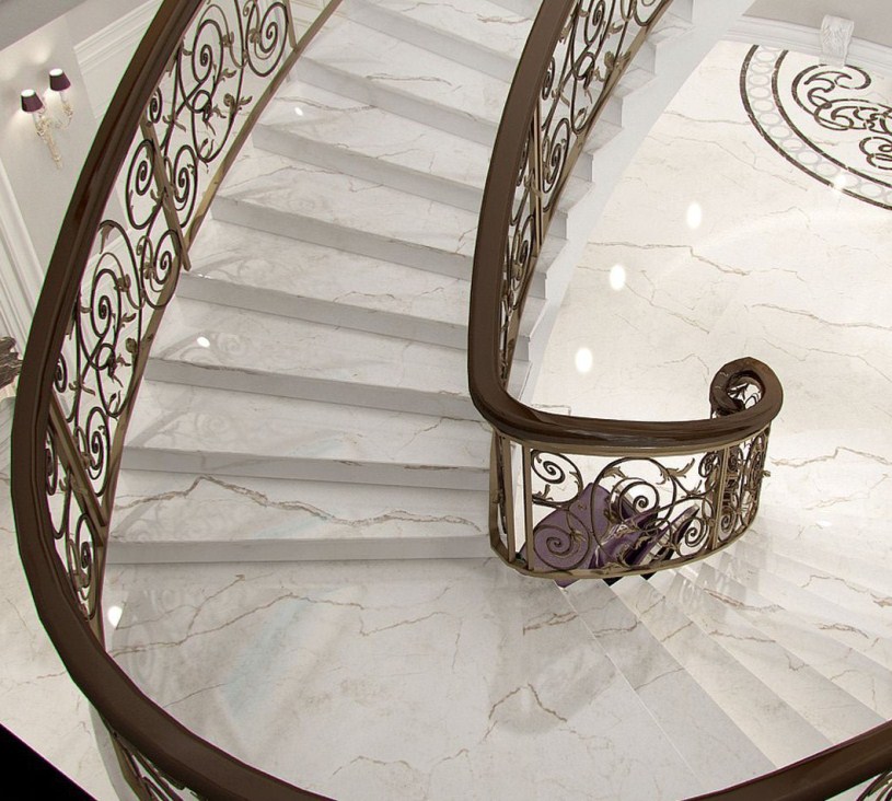 Независимо от материала ступеней дизайн конструкции выбирается в соответствии с интерьерным стилем; продумывается оформление и материал ограждающих конструкций. Во время эксплуатации мраморная поверхность нуждается в периодическом уходе.