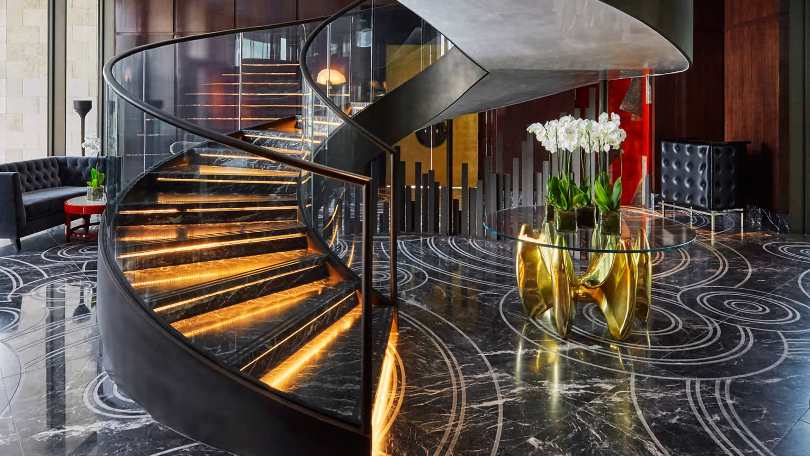 Мраморная лестница с подсветкой и стеклянной ограждающей конструкцией