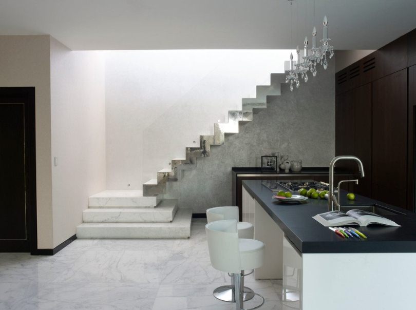 Имея большое и просторное жилое пространство, можно реализовать самые разные идеи дизайнерского оформления помещений и мраморной лестницы в частности.