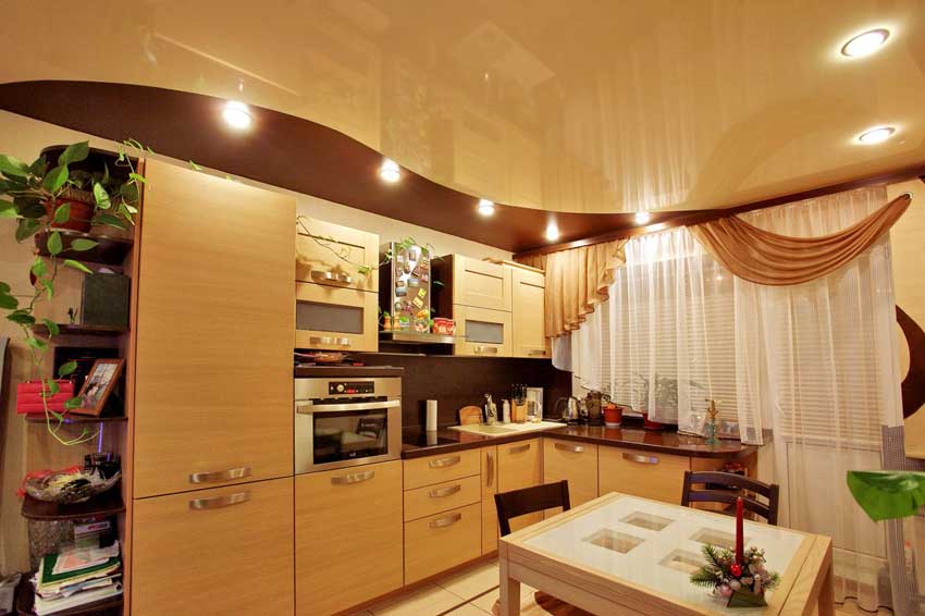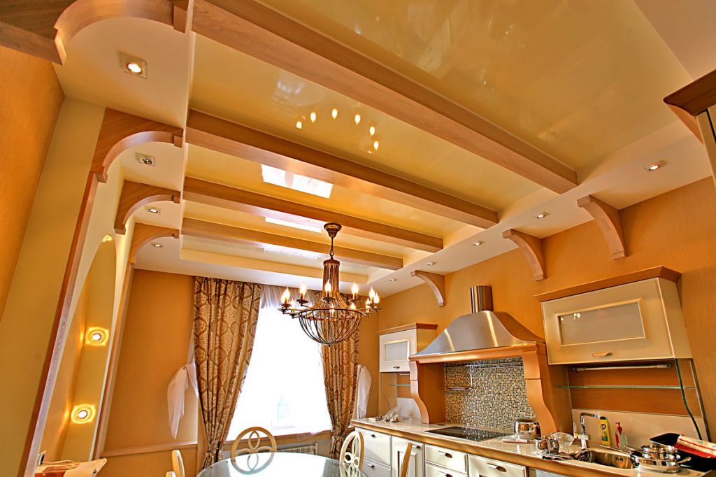 Конструкции используют для создания натяжных потолков в кухне хрущевке. В отличие от других покрытий, глянцевые потолки: