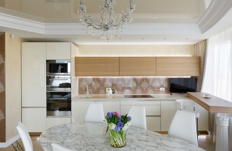 Многоуровневые глянцевые натяжные потолки в интерьере кухни классического стиля