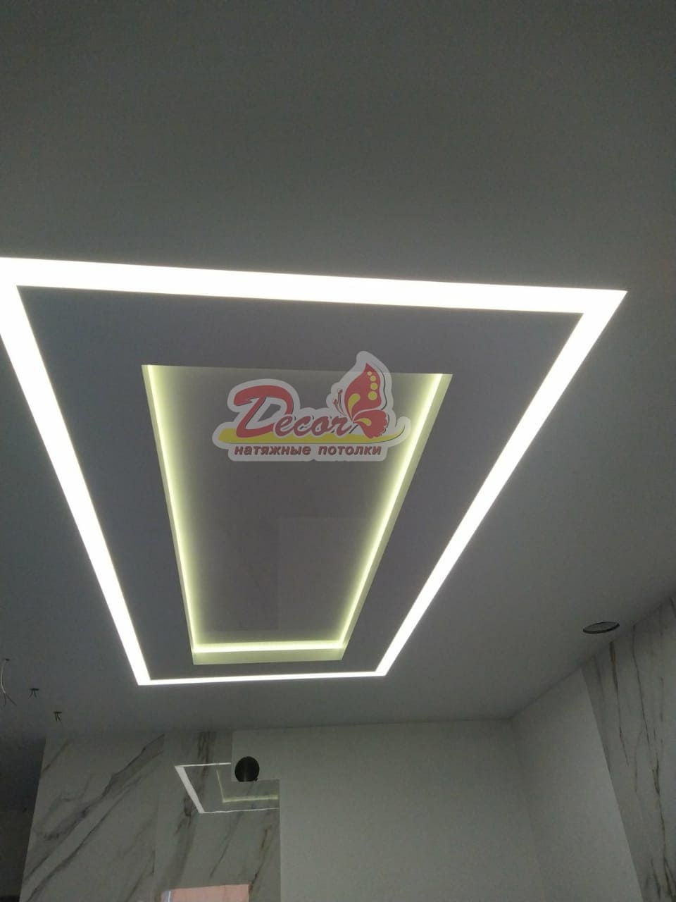 Натянутая пвх-пленка в готовом виде имеет идеально ровную поверхность, что смотрится очень классно. Но, от несущей верхней стены она находиться на расстоянии примерно 5-10 см, и таким способом позволяет замаскировать строительные неровности, не прилагая для этого больших усилий и соответственно затрат. А также скрывает остальные коммуникации типа труб и электропроводки;
