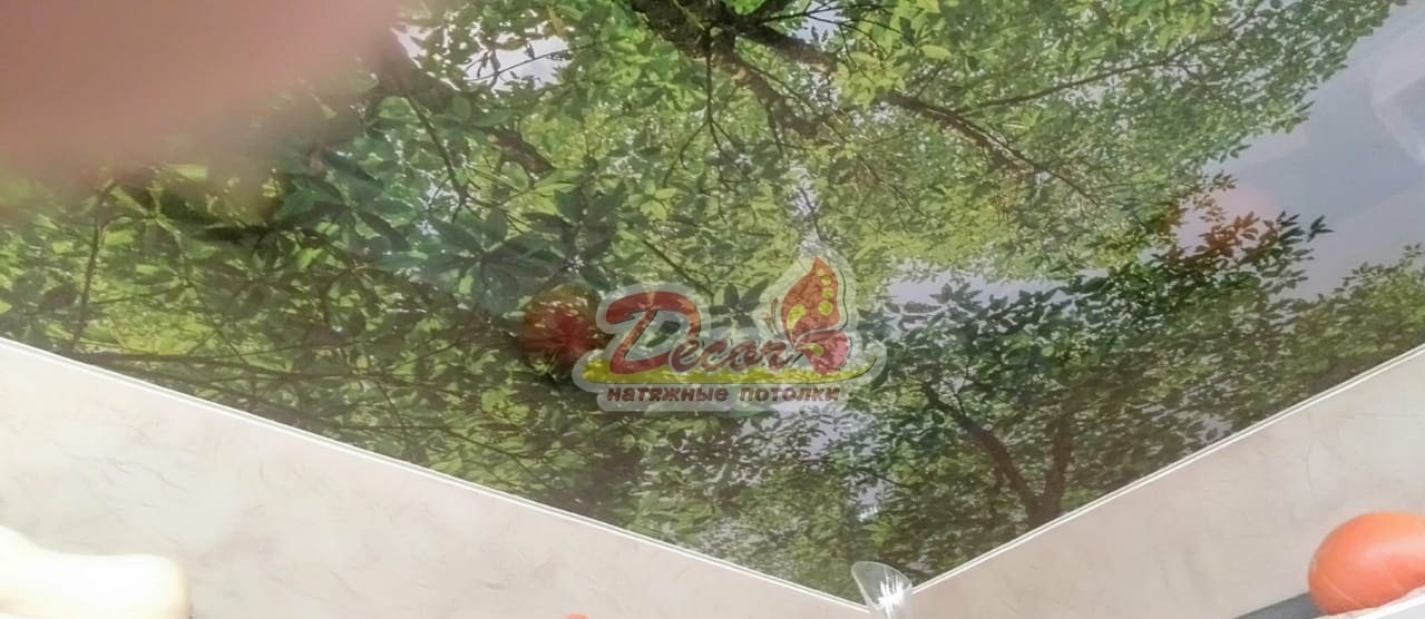 реалистичное изображение – в этом случае натяжное полотно, а чаще его фрагмент, воспроизводит реальный объект: трава и цветы на лугу, цветущие ветки яблони, небо с облаками. Обычно фрагмент с изображением комбинируют с однотонным полотном.