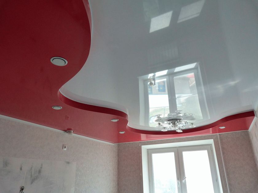 - красный – полотно настолько яркого цвета, как правило, комбинируется с белой гипсокартонной конструкцией. Обязательное условие – глянцевый блеск.