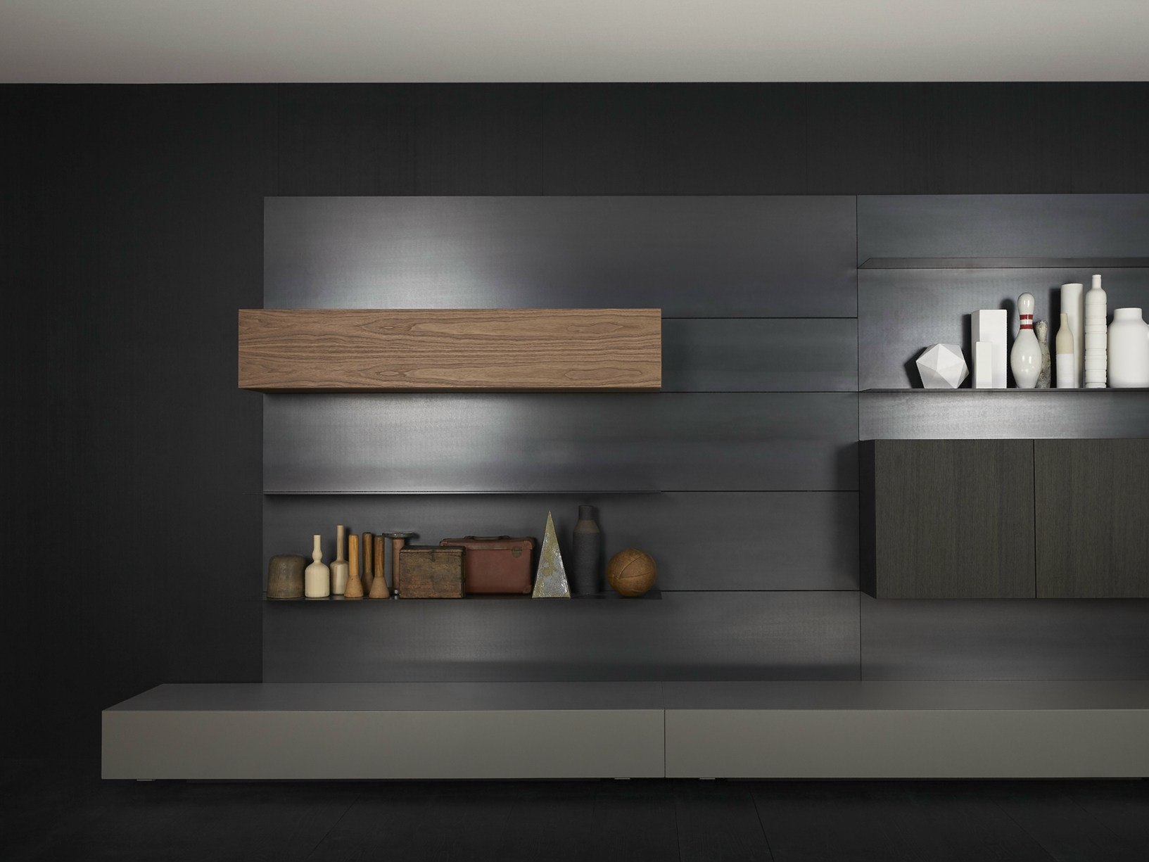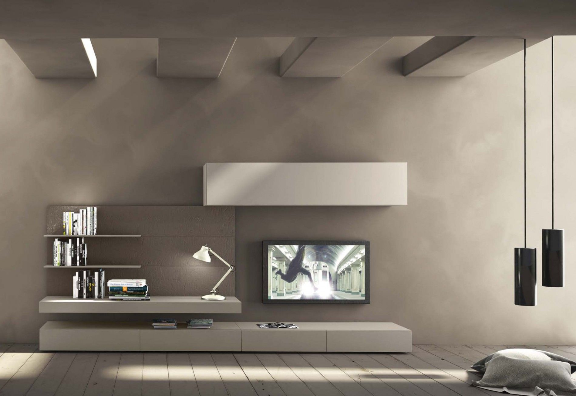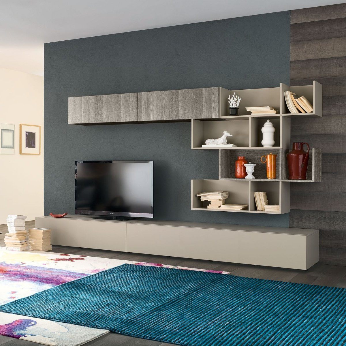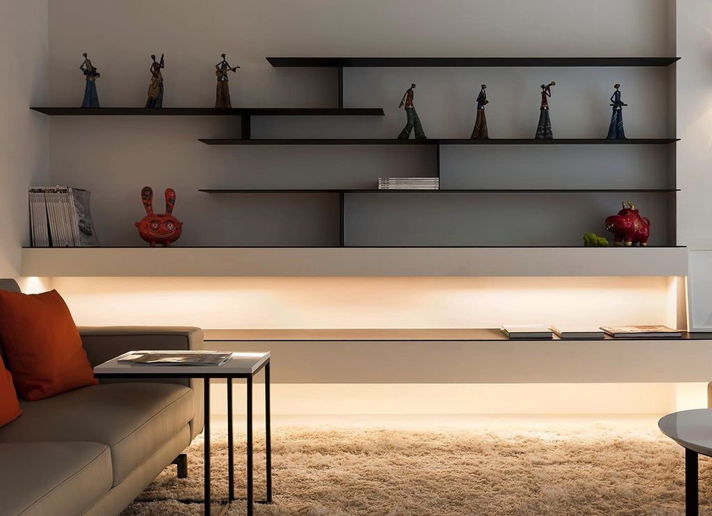 На фото асимметричная полка на стене закрытого типа в дизайне современной гостиной.
