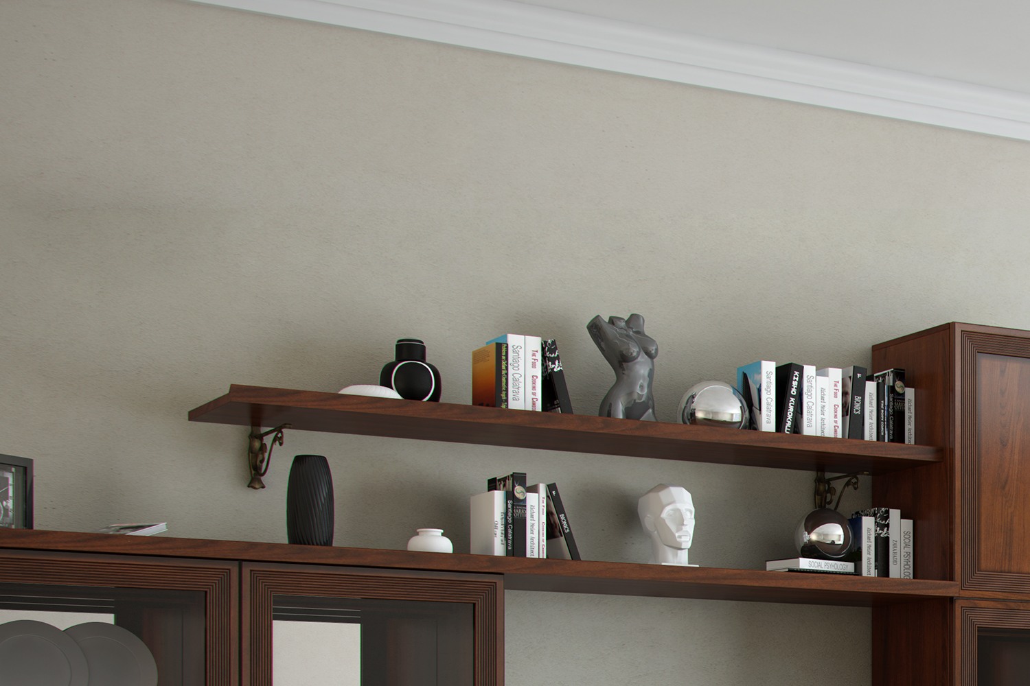 Почти втрое дешевле вам обойдутся полки из МДФ. Современное производство позволяет делать высококачественную имитацию натурального дерева, так что ваша библиотека будет выглядеть также роскошно, но немного строже за счёт отсутствия резных деталей.