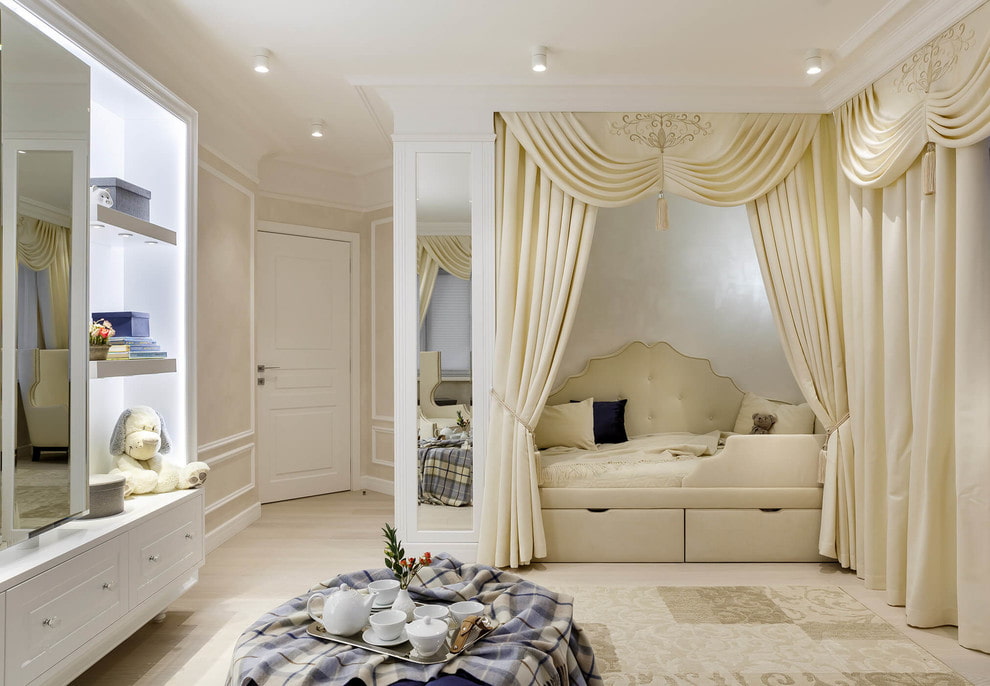 Аккуратное и удобное расположение кровати в углублении считается весьма распространенным дизайнерским приемом, рационализирующим полезную площадь.