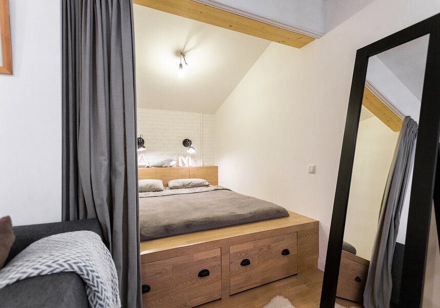 Спальная зона в нише в виде подиумной конструкции с местами для хранения существенно сэкономит площадь в студии и сделает ее планировку намного интереснее.