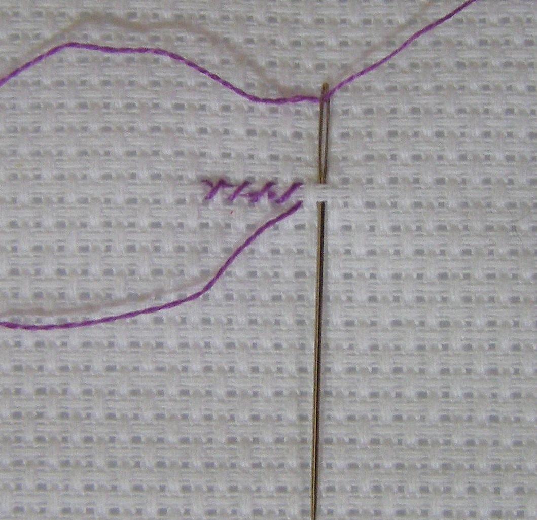 Игла для вышивания крестиком не должна иметь острый кончик и повреждать канву. Ее закругленный конец должен раздвигать волокна основы и попадать в угловое отверстие.