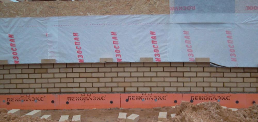 Сверху теплоизоляционный материал укрывается ветроизоляционной мембраной – фиксируется она степлером к рейкам каркаса, обязательно паропроницаемой стороной к утеплителю. Предусматривается вентиляционный зазор, и можно начинать кладку.