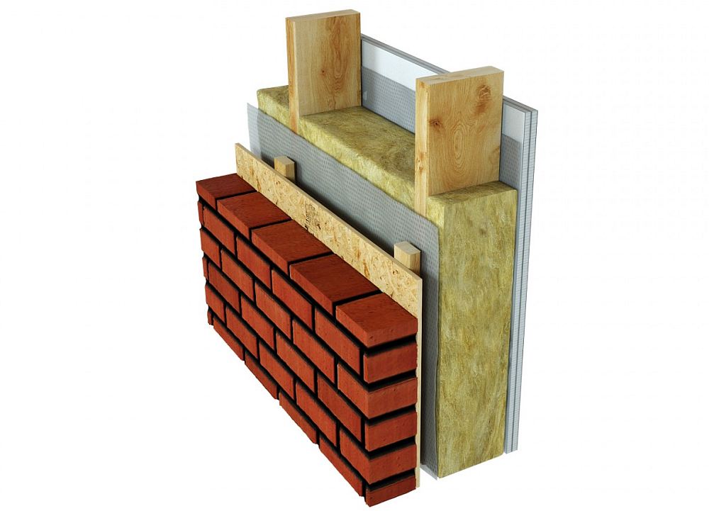 Монтаж обрешетки на стены осуществляется с шагом, который на 10-30 мм меньше ширины плиты минеральной ваты, это способствует максимально плотному прилеганию утеплителя к каркасу и отсутствию «мостиков холода».