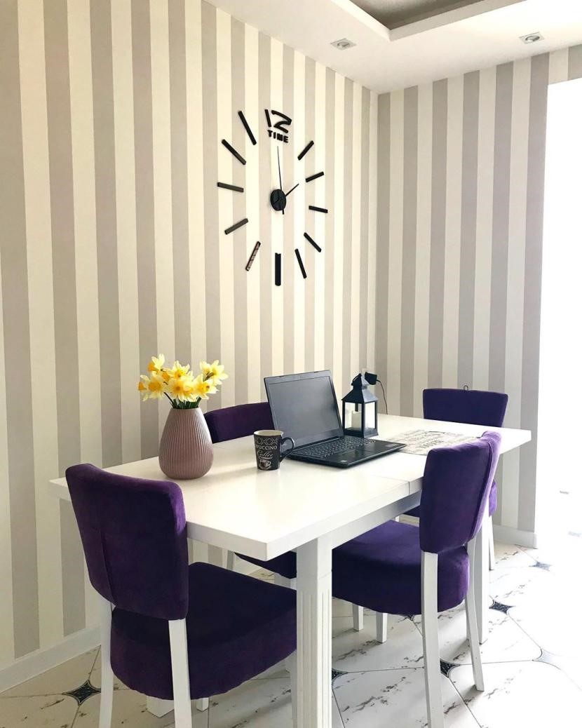 Довольно интересный способ визуального изменения помещения – разделение зон при помощи рисунка на обоях. Самый простой вариант – комбинирование полосатого орнамента, когда одна часть кухни увеличивается в высоту, а другая – в ширину.