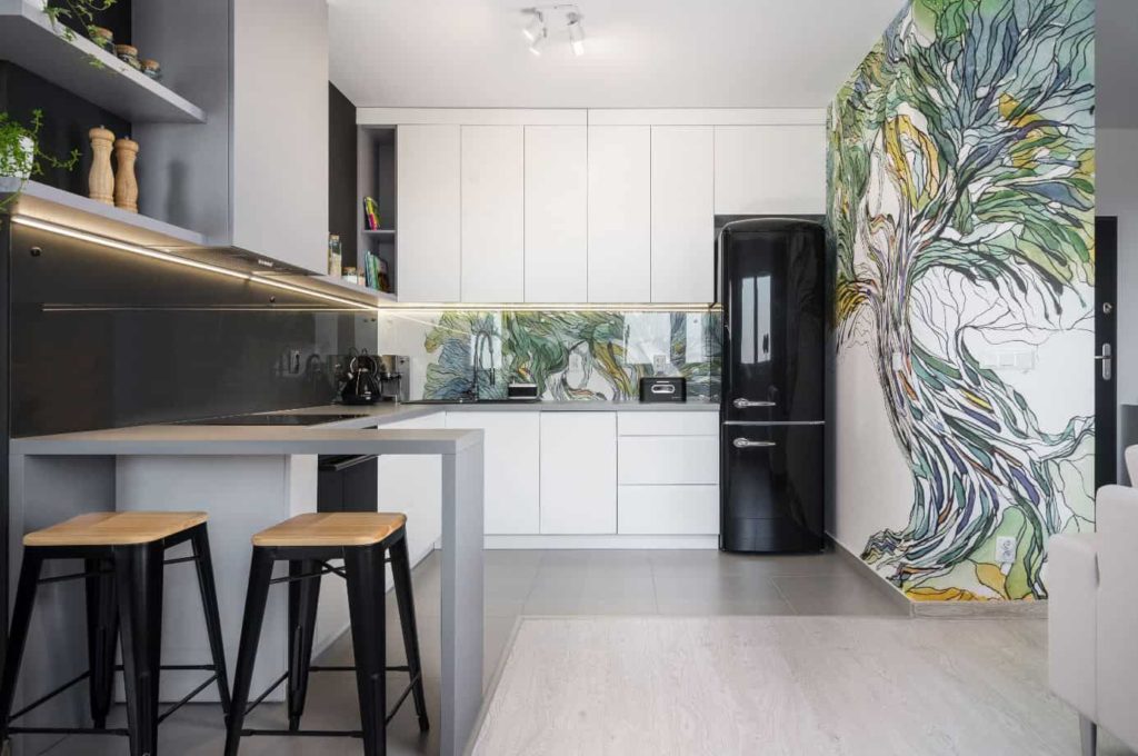 Обои на кухне — это простой способ обновить место, которое быстро загрязняется. Благодаря этому вы можете легко изменить цвет стены, внедрить сильный графический элемент, модернизировать расположение кухни. На данный момент обои являются самыми модными над кухонной столешницей и они часто ссылаются на кулинарные темы. Они могут быть узорами с фруктами, травами, специями, готовыми блюдами, но удивительные сочетания выглядят также великолепно: пейзажи, графика, типографика.