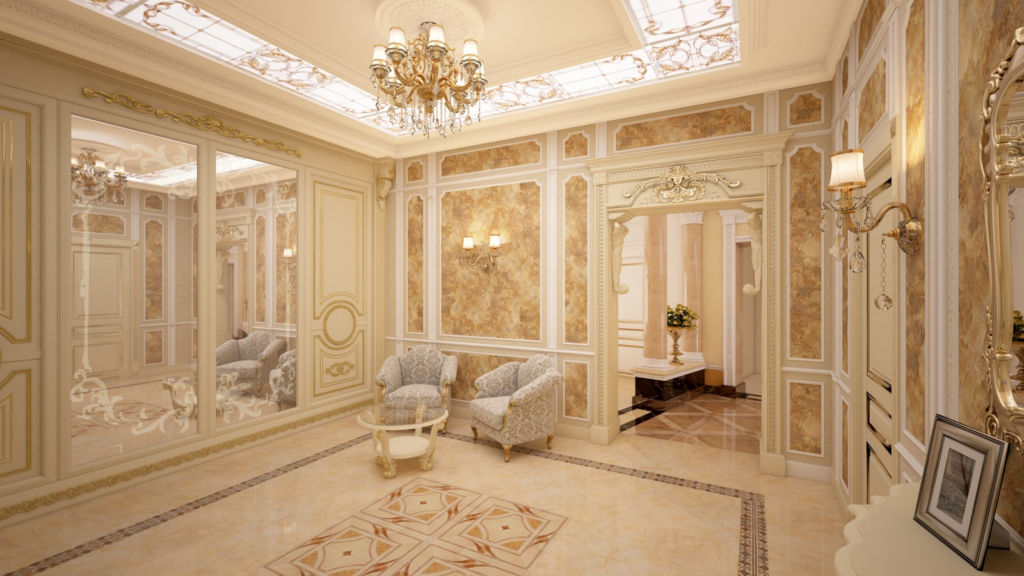 Если прихожая маленькая, то поверхности лучше сделать глянцевыми, так как матовые покрытия визуально уменьшают пространство. Лучше выбирать вариант с неприхотливыми узорами или геральдическими орнаментами.