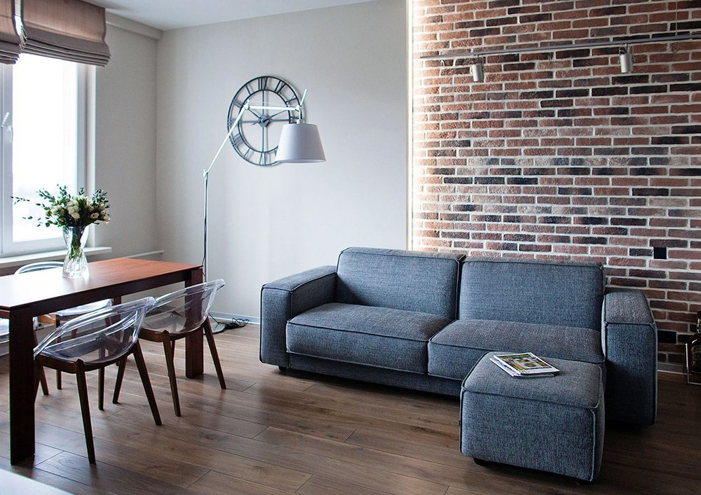 Кирпичная стена в сочетании с соответствующим интерьером смотрится стильно. Но облицовка поверхностей натуральным кирпичом – процесс трудоемкий и долгий. Плюс, такая отделка немало весит и крадет драгоценные квадратные метры.