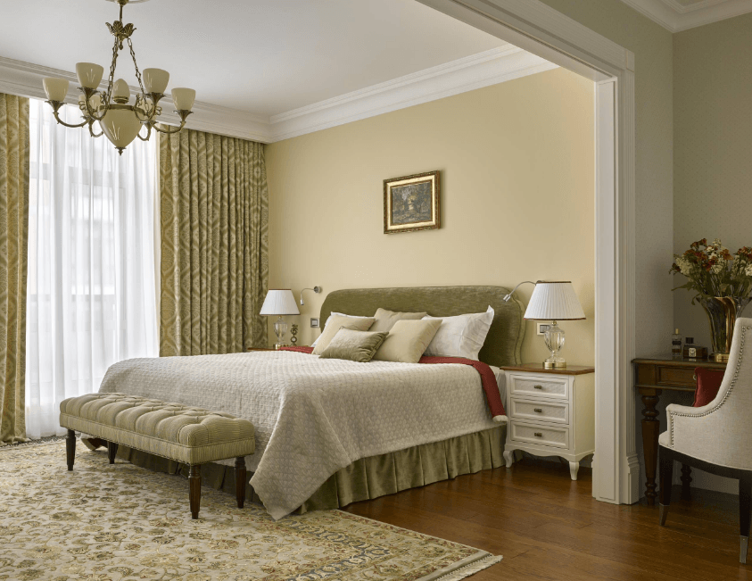 Напротив, если в спальне недостаточно солнечного света, то лучше присмотреться к спокойным, мягким оттенкам с теплым подтоном. За счет этого можно сделать комнату более уютной