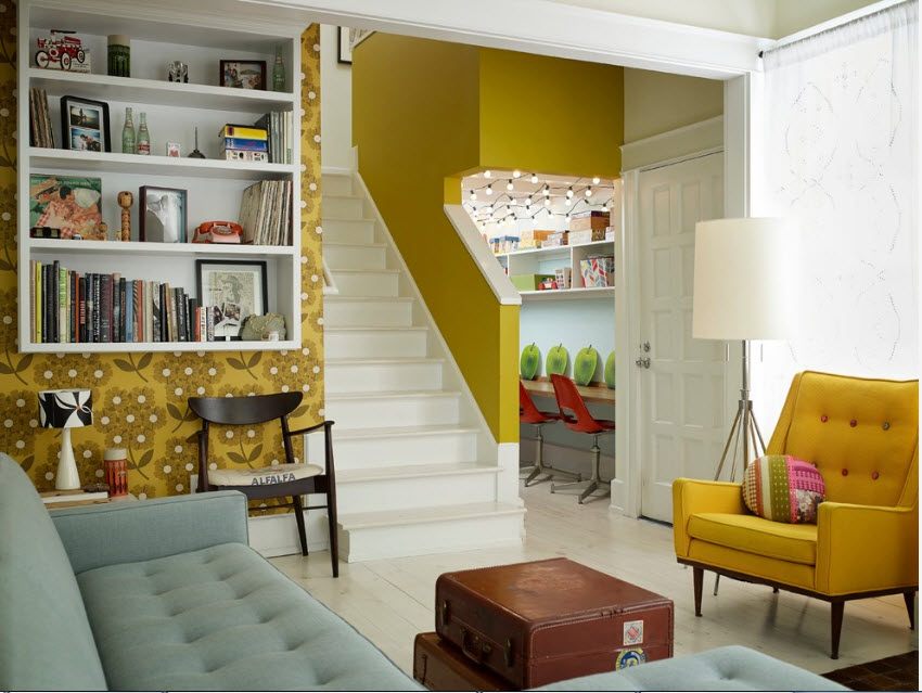 Эта комната предназначена для посиделок с родственниками и друзьями, а цветовая гамма в ней должна настраивать на позитивный, веселый лад. Однотонные зеленые обои в гостиной будут смотреться скучно и расслабляюще, а вам ведь этого не нужно. Поэтому, лучшим решением для оформления гостиной являются яркие оттенки зеленого в сочетании с другими. Выделение акцентов в помещении гостиной происходит с помощью оформления некоторых частей стены обоями с ярким узором, как на фото.