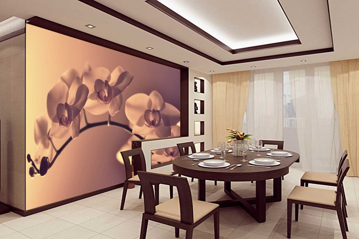 Оптимальным выбором для столовой будут качественные флизелиновые либо виниловые материалы с розами, ромашками, орхидеями.
