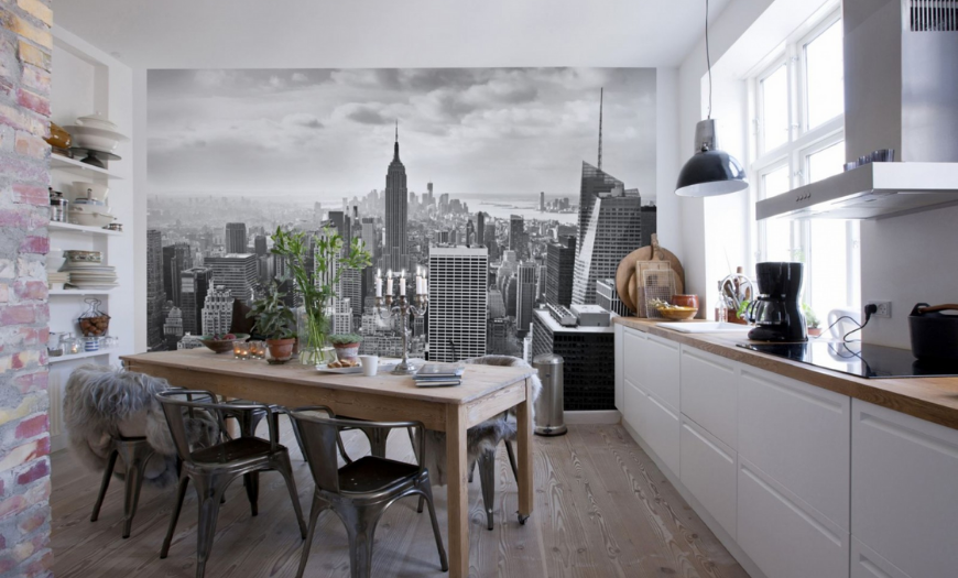 На фото – пример использования фотообоев при оформлении стен в современной кухне.Подобный вариант интерьерные профессионалы рекомендуют использовать при проведении косметического ремонта в малогабаритных столовых.
