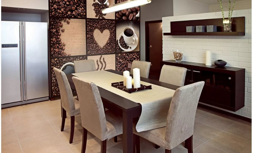 Интересным вариантом оформления обеденной зоны профессионалы называют создание на поверхности стены акцента из фотообоев. Многообразие фотообоев с реалистичными объемными изображениями растительного и животного мира, превратят кухню в настоящий райский уголок.