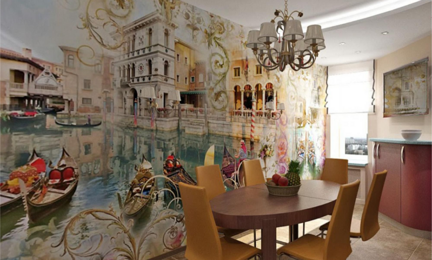 Фотообои в кухню старайтесь подбирать на флизелиновой основе. Такие полотна имеют высокую плотность, идеально подходят для данного помещения.