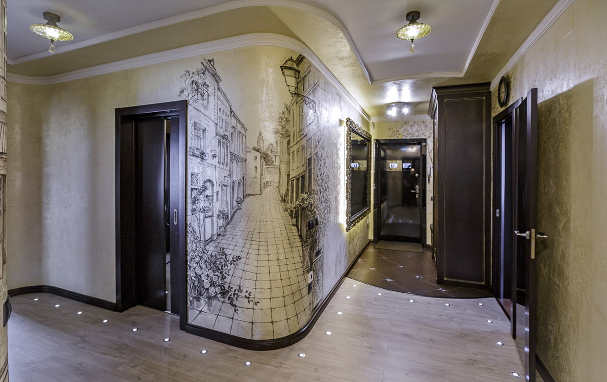 При отделке прихожей можно использовать фотообои. Это довольно популярный прием среди дизайнеров. Фотообои позволяют обыграть идею по оформлению интерьера максимально интересно.