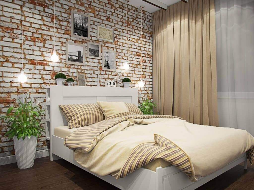 Учтите, что оформлять все четыре стены в спальне таким – не самая хорошая идея. Лучше сделать одну стену с имитацией кирпичной кладки, а остальные три оклеить обоями более нейтральных оттенков.