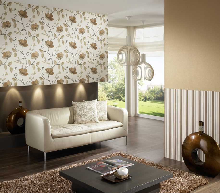 Для того чтобы избежать монотонности интерьера, можно акцентировать внимание на одной из стен, оклеив её обоями с броским рисунком. Например, центральную часть стены выделить обоями с крупными цветочными или геометрическими мотивами, а по бокам использовать другой тип, чтобы акцентировать внимание на центральной части