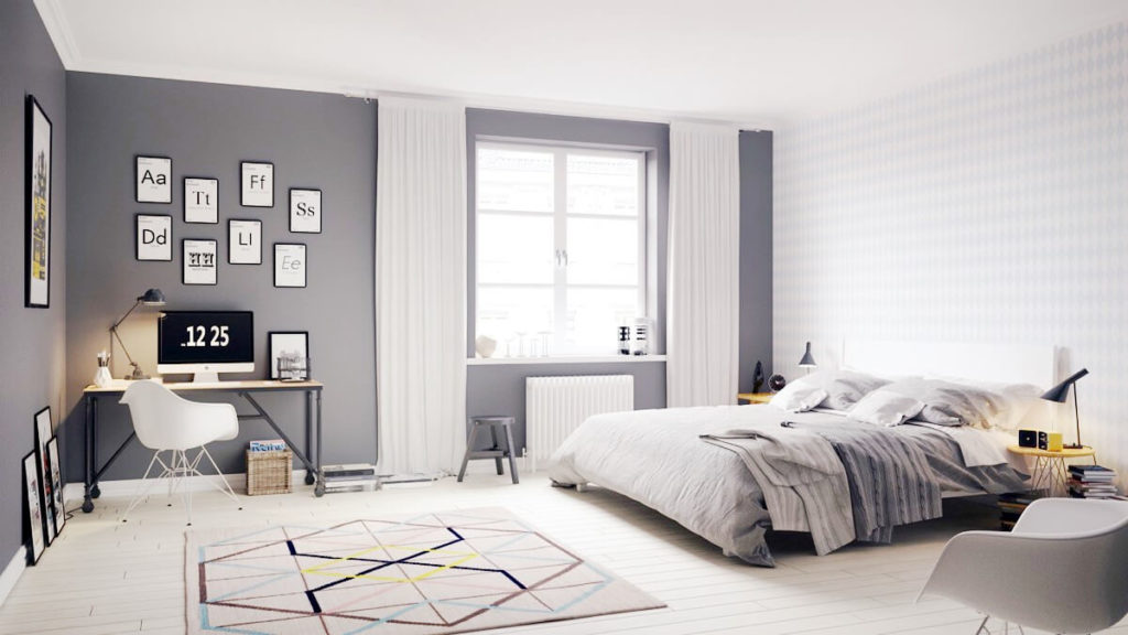 С белой мебелью и серыми узорами на ковре в спальне можно сочетать серые стены. Но таким оттенком перегружать спальню не нужно.