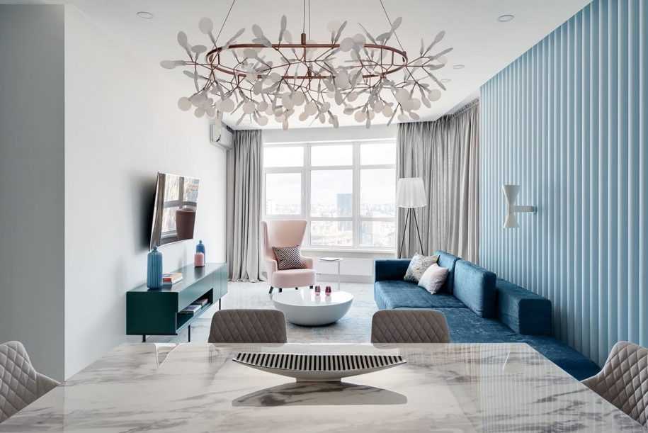 К светлой и темной мебели подходят голубые стены. Этот цвет успокаивает, расслабляет, вызывает положительные эмоции. Но при недостаточном освещении вызывает слабость и усталость. Поэтому голубые стены желательно делать для солнечных комнат.