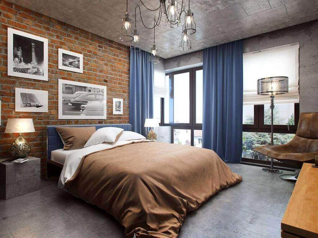 Для спальни, выполненной в этом интересном стиле, стоит подобрать обои, напоминающие состаренные стены. Они могут имитировать кирпичную укладку светлых, коричневых оттенков. Еще одним удачным решением для основы интерьера можно назвать обои «под бетон».