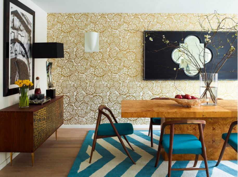 - Обои с абстракцией и замысловатыми рисунками в насыщенных, но не кричащих цветах – это арт-деко. Этот стиль отличают роскошь и оригинальность.