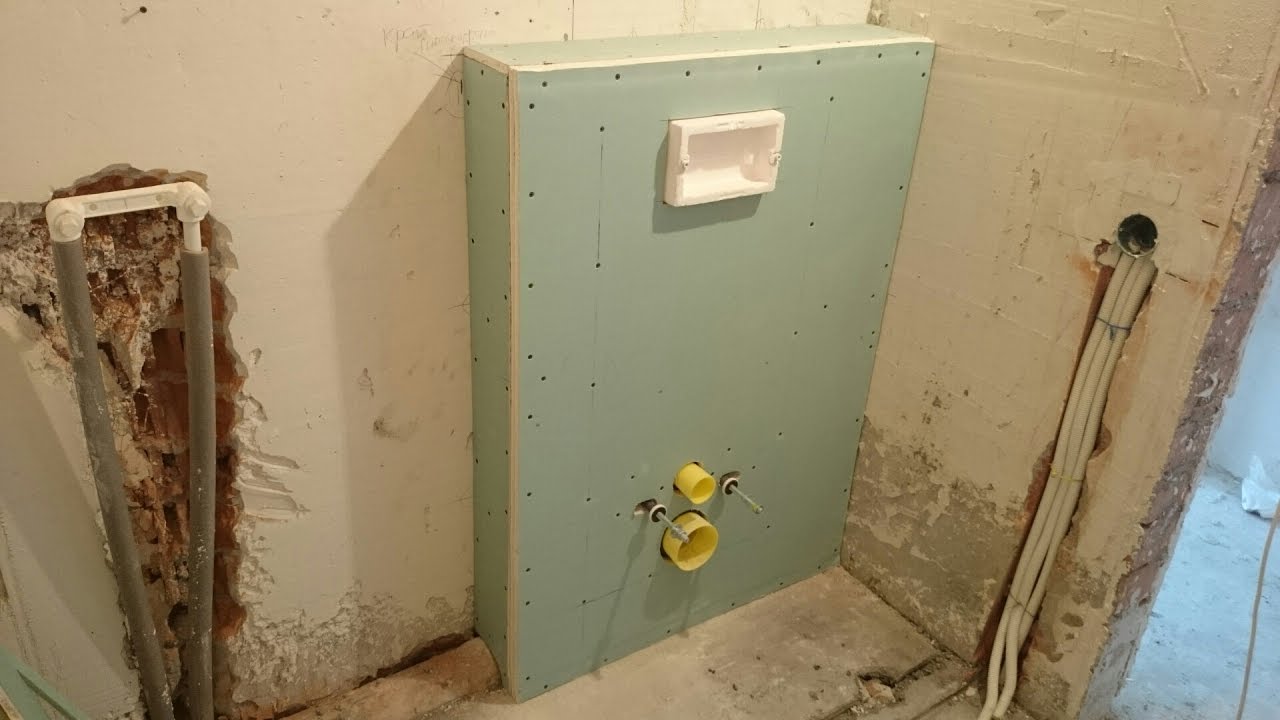 - Как правило, по стене, где устанавливается инсталляция, проходят коммуникации: водопроводные и канализационные трубы. Их также потребуется скрыть с помощью короба из гкл. Вследствие чего всю поверхность лучше скрыть под гипсокартонной отделкой. Предварительно под каркас делается разметка.