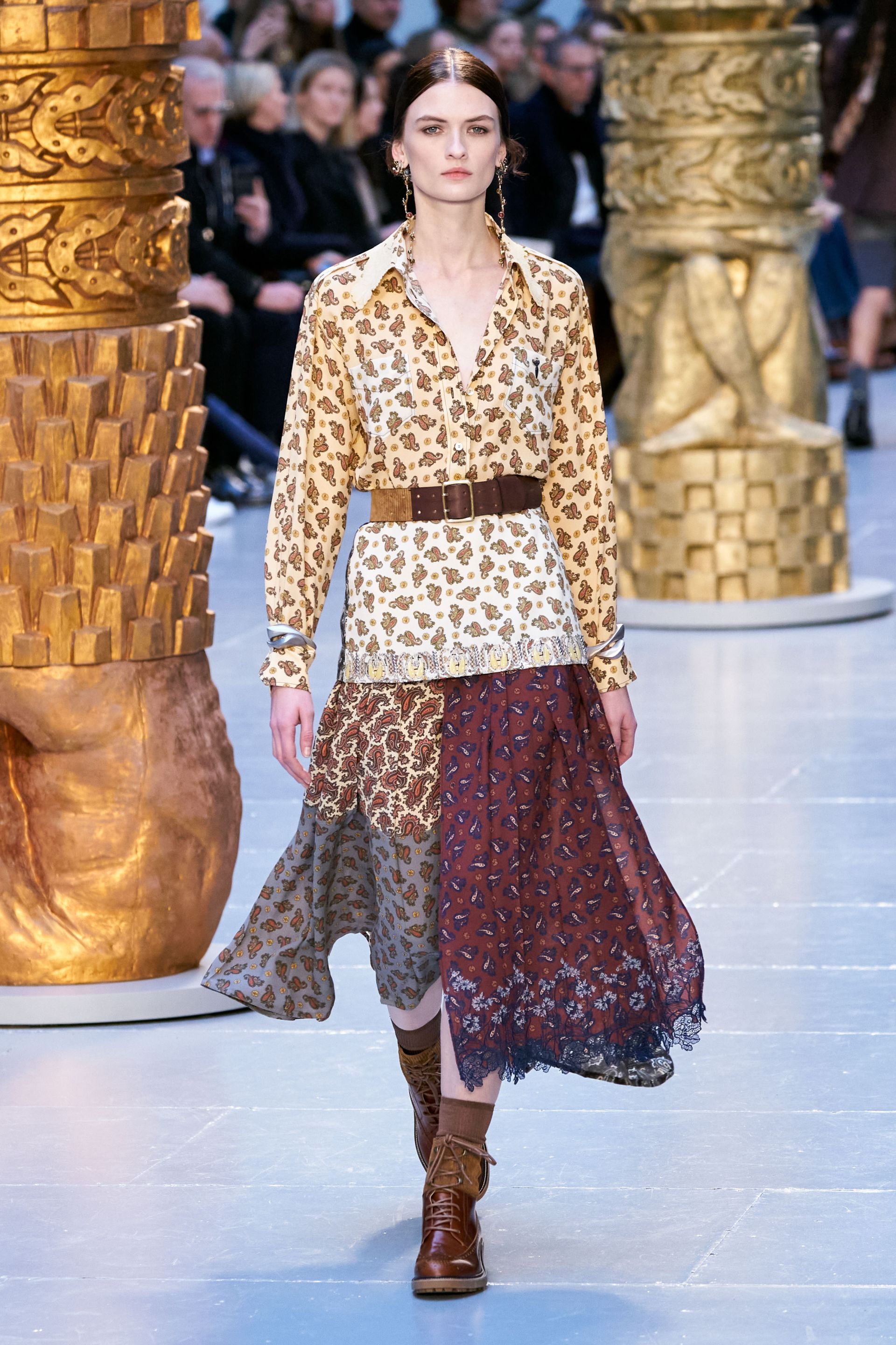 Chloè не стал расставаться с приятными воспоминаниями о лете, а заодно и с легкими тканями и показал, что для пэчворка подходит даже невесомый шифон с абстркатными принтами. Носить такие юбки с асимметричным подолом можно и в офис с однотонными рубашками и казаками – еще одним трендом осени, и на вечеринки в стиле бохо, дополняя образ блузами с длинными рукавами и украшениями из натуральных материалов – богемный шик и мечтательность в этом сезоне снова будут в моде.