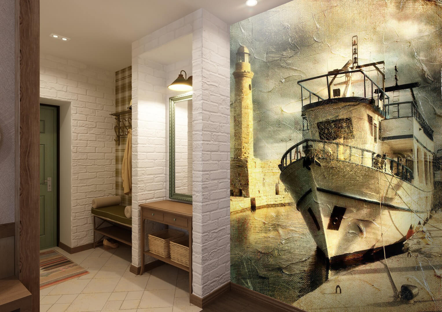 Невероятно красиво в интерьере прихожей смотрятся живописные панно. В основном они довольно большие, с тщательно прорисованными деталями. Поэтому многие называют их настоящими произведениями искусства. При желании можно дополнительно украсить их кирпичной кладкой в небольшом количестве.