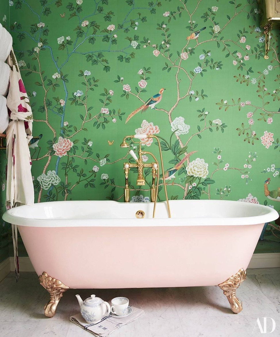 - Обои с крупным рисунком. Конечно, покрытие обязано соответствовать всем требованиям: не отклеиваться от повышенной влажности и не коробится от перепадов температур. Особенно хорошо, если обои напоминают чуть винтажные мотивы, это поможет создать модный интерьер ванной комнаты. Обстановку стоит выбрать также в немного старинном ключе: низкие столики, чуть пошарпанные шкафчики и другие аксессуары «из бабушкиного сундука».