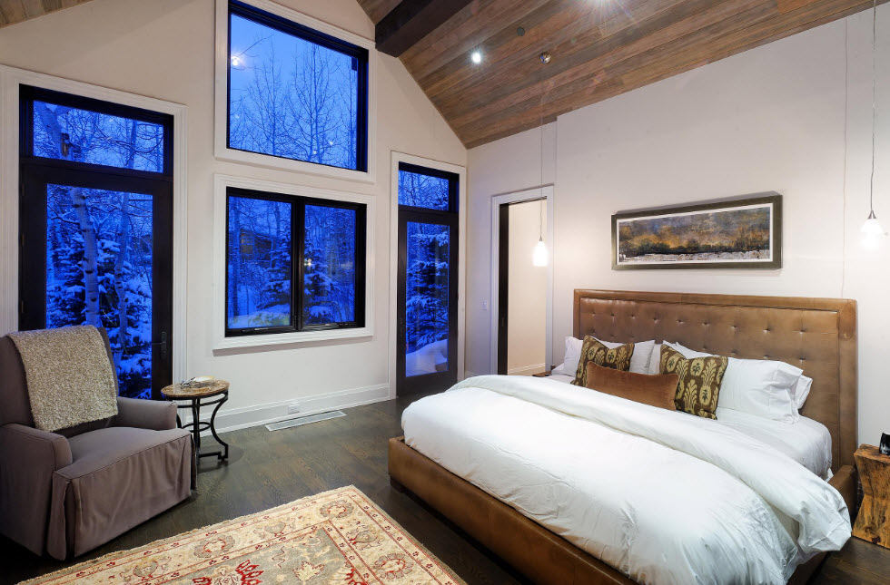 Современное оформление бывает характерно для спален с большими, панорамными или нестандартными оконными проемами. Такие окна сами по себе оригинальны и не требуют дополнительного декорирования.