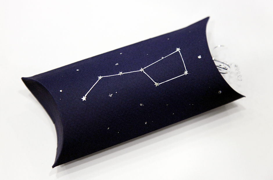 4. Чтобы оформить коробочку так, как это сделали мы, выберите понравившееся созвездие и нарисуйте его белой гелевой ручкой (лучше это делать на еще не свернутой коробочке). Чтобы приклеить звездочки (снова любимый «Леонардо», 72 р.), обмакните коник зубочистки в клей, сделайте точку на бумаге и приложите звезду. Мы использовали клей ПВА, но имейте в виду, что синтетические материалы он держит не очень-то крепко. Второстепенные звездочки можно сделать из простых мелких блесток (они обойдутся примерно вдвое дешевле, чем фигурные) – так же нанесите клей на бумагу и просыпьте на это место немного волшебной пыльцы.