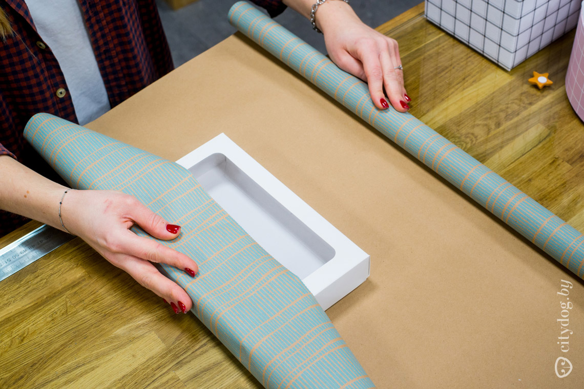 Как можно плотнее заворачиваем коробку в бумагу, слегка натягивая её, чтобы не морщилась. Снимаем со скотча защитную плёнку и приклеиваем подогнутый край.