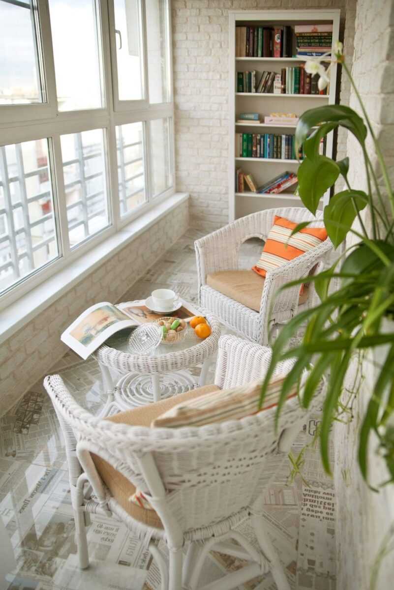 Самый популярный вариант для обустройства балкона — плетёная мебель. Магазины предлагают большой выбор для создания красивого и уютного помещения. Для комфорта и тепла подойдет мягкий ковер. Стены украшаются коллажем с семейными фото или живописными картинами.