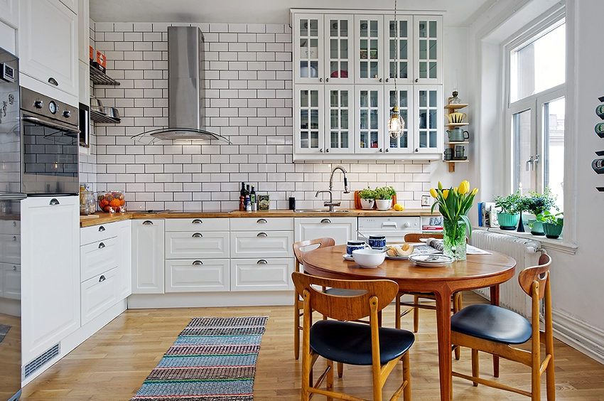 Разрабатывая дизайн-проект кухни, отдавайте предпочтение светлым цветам при оформлении стен и подборе мебели. Все-таки они лучше отражают свет, и это существенно облегчит вам задачу для создания уютной атмосферы в комнате.