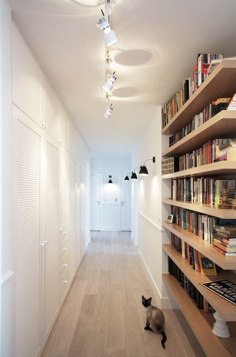 В узком коридоре рекомендовано устанавливать несколько осветительных приборов. При этом свет должен быть направлен на противоположную сторону. Светильники, расположенные наверху, должны светить на стены. Это позволит зрительно сделать коридор шире.
