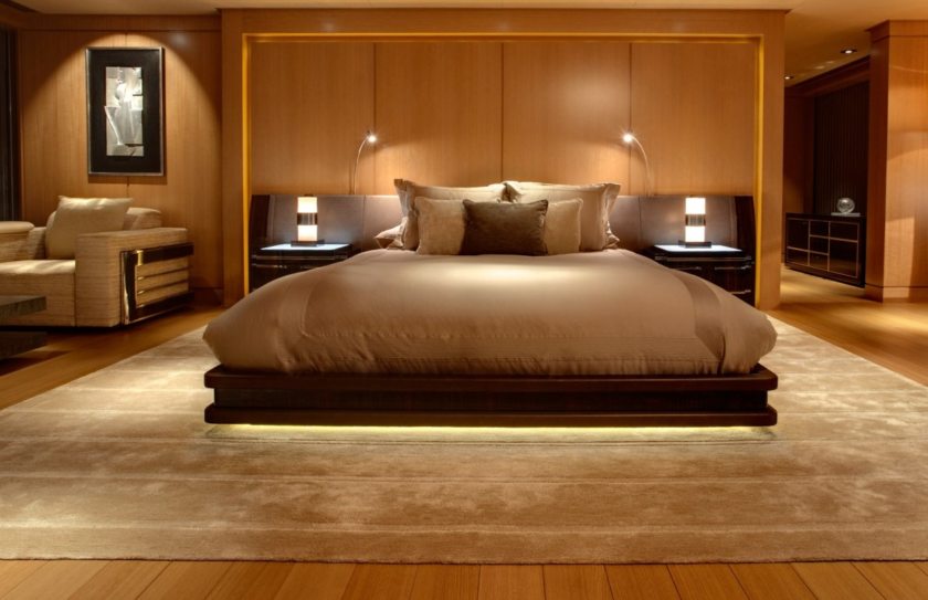 Можно разместить, например, источник света за изголовьем, чтобы освещение рассеивалось вверх, по направлению к потолку. Такой вариант дает достаточно света, а из-за того, что источник скрыт, атмосфера в спальне становится более таинственной и романтичной. Можно при помощи светодиодной ленты осветить прикроватное пространство, закрепив ее на стене или на полу. Избегайте в данном случае цветных решений, так как рассеянный синий, зеленый или красный свет может превратить Вашу спальню в ночной клуб или место для новогодней вечеринки.