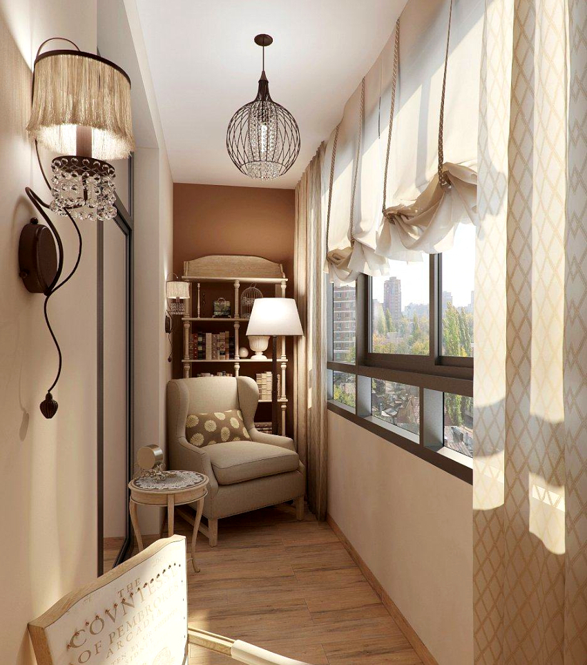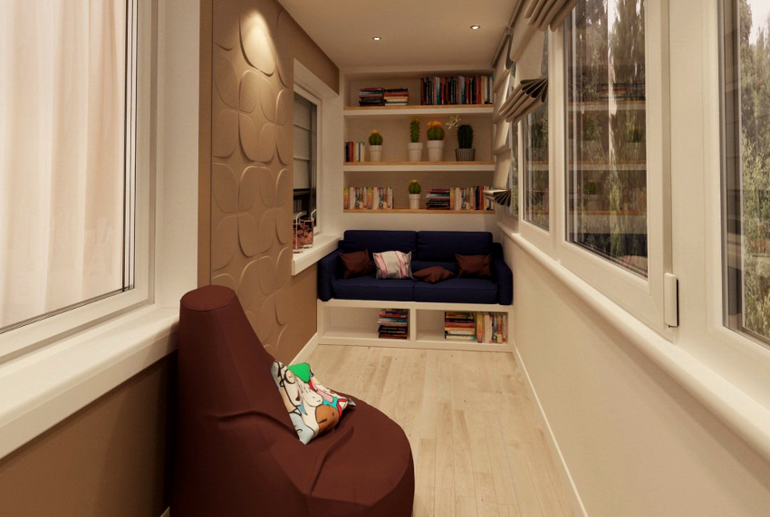 С целью практичности можно разместить на лоджии сразу несколько зон, например оборудовать небольшую, но комфортную рабочую зону и обязательно удобное кресло, а в противоположном углу разместить раскладной диван для свободного времяпровождения и отдыха.