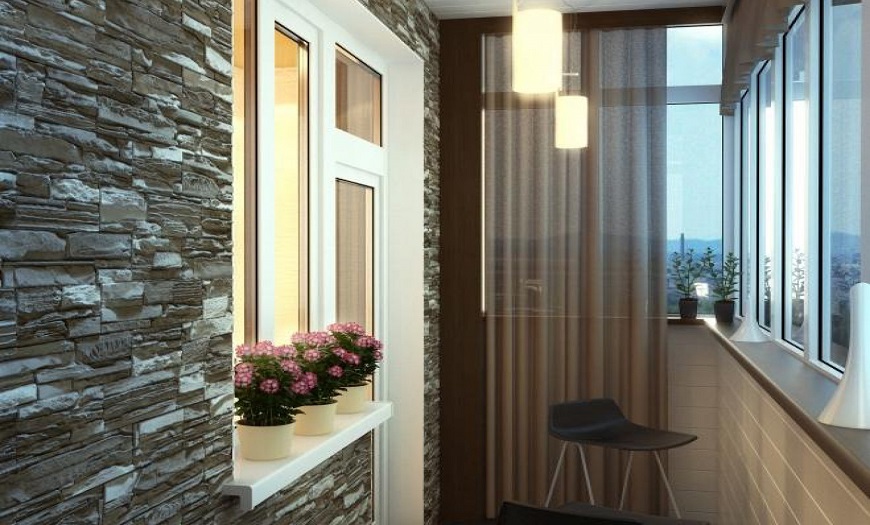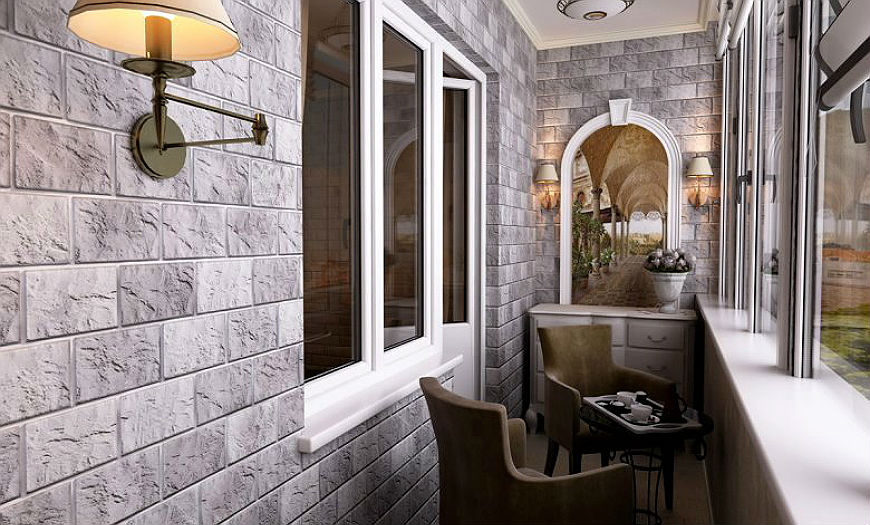 Для отделки балкона либо лоджии используют декоративный камень из разного материала. Он представляет собой рельефную плитку, лицевая поверхность которой напоминает кирпич.