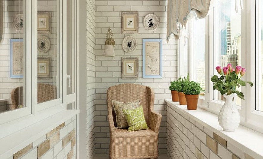 Отличным решением станет воплощение деревенской стилистики, например, кантри или французского прованса. Дизайн балкона и лоджии с кирпичной стеной в этом случае может подчеркиваться кирпичом белого цвета, поскольку эти интерьерные стили тяготеют ко всему светлому.