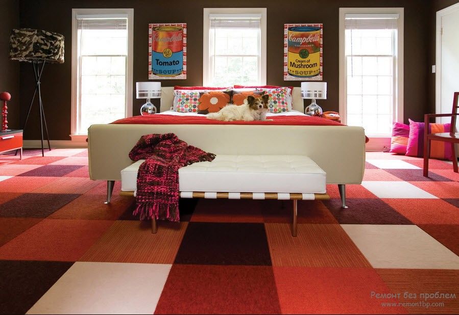 В продолжение темы о том, что выбрать для спальни, нельзя не упомянуть и про ковролин. Он очень комфортен, обеспечивает не только хороший внешний вид полу, но и прекрасную звукоизоляцию. Это не то, что ламинат, на котором слышно даже, как ночью топает кошка. Преимущество этого покрытия в том, что он избавляет от необходимости покупать напольный ковёр, а это тоже кое-какая экономия.