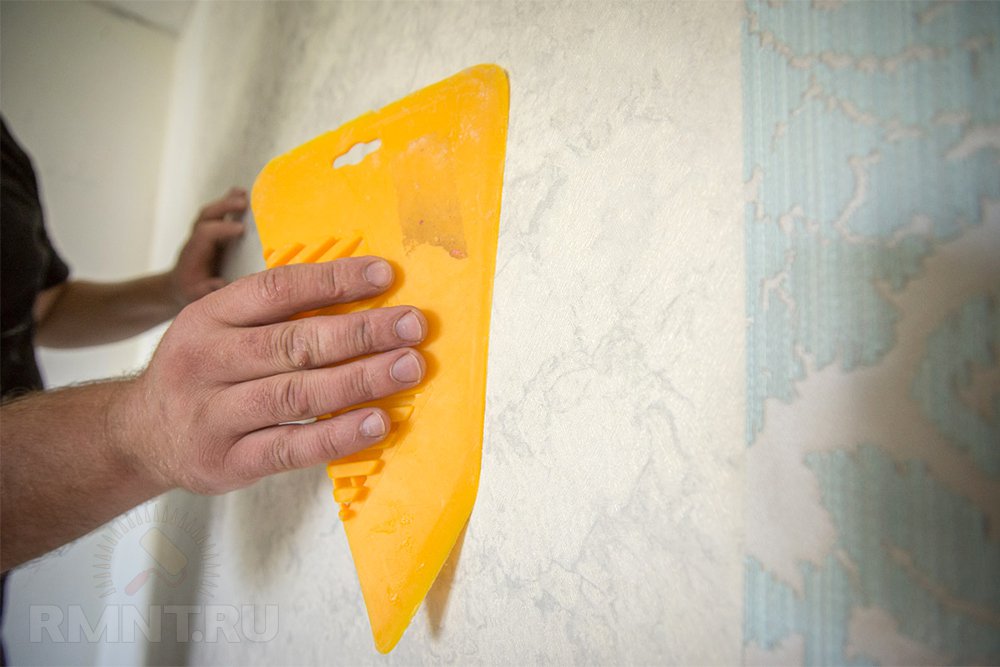 - При наклеивании рулонного материала – начинайте с угла или крайней точки. Двигайтесь сверху вниз.